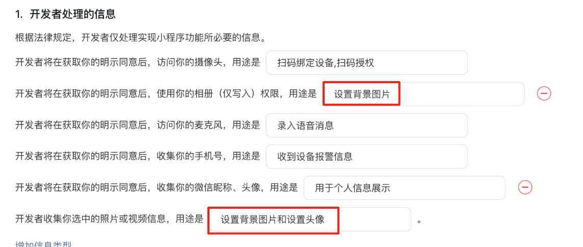 平台提示:接口用途内容说明需要填写合理使用内容,避免无关内容,小程序隐私保护指引内容(含补充文件内容)审核通过后将公开展示在《用户隐私保护指引》内容页面。