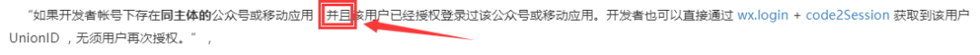 “如果开发者帐号下存在同主体的公众号或移动应用,并且该用户已经授权登录过该公众号或移动应用。开发者也可以直接通过 wx.login + code2Session 获取到该用户 UnionID ,无须用户再次授权。”,