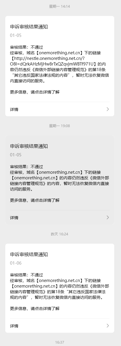 你好,经审核,域名【onemorething.net.cn】下的链接【http://nestle.onemorething.net.cn/?O8l=dQrkAHzMjHw8rTxQZqvjmWBTf971U】等链接的内容存在违反《微信外部链接内容管理规范》的第10条“低俗色情类内容”,现经核实相关违规内容已修改,但因该域名下的内容多次违反《微信外部链接内容管理规范》,微信需对其进考察,暂不恢复微信内直接访问的服务,考察期满若内容合规,则将恢复微信内直接访问的服务,否则将不予提供该服务,请知悉。