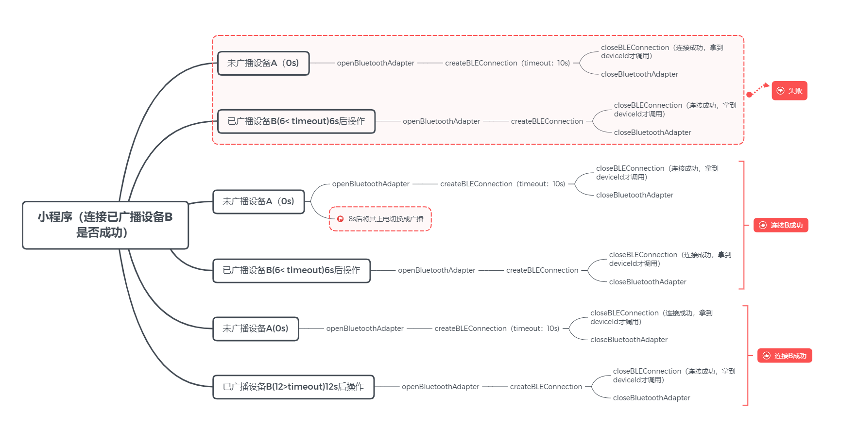 (0S)wx.openBluetoothAdapter ---(timeout:10S) wx.createBLEConnection(连接A) -- (5S)wx.closeBLEConnection