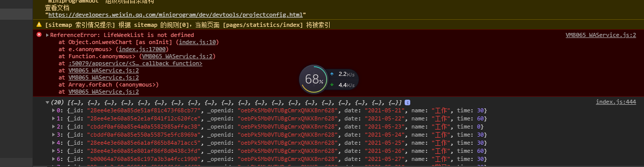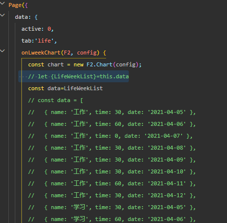 我这里需要画个图表,用的是@antv/wx-f2组件,他是直接在data数据里使用,我现在要使用数据库数据画图,失败,求大神解决。代码如下