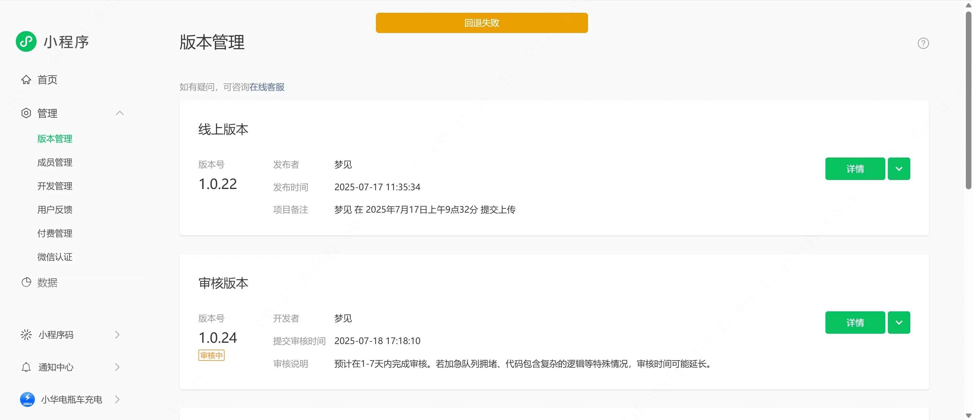 小程序1.0.23取消灰度发布后,线上版本是1.0.22,因运营策略问题想回退到历史上一个稳定的版本1.0.20发现版本回退失败,手机里微信操作界面提示成功,但PC管理后台提示失败,实际上确实是版本回退失败
