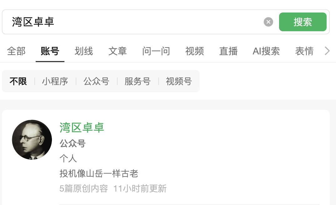 求助官方:我公众号的名字-《湾区卓卓》为何无法从账号搜索到?是名字不行还是?
