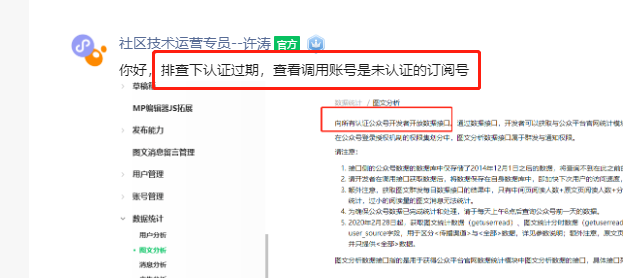 你好,排查下认证过期,查看调用账号是未认证的订阅号