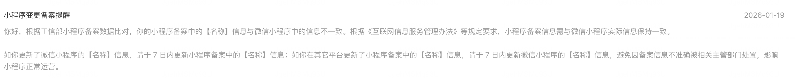 小程序原名称“优学天地”,去年年审时更名为“优学海洋”,今天收到了“小程序备案中的【名称】信息与微信小程序中的信息不一致”的提醒,为啥?年审不能更改备案中的名称吗?