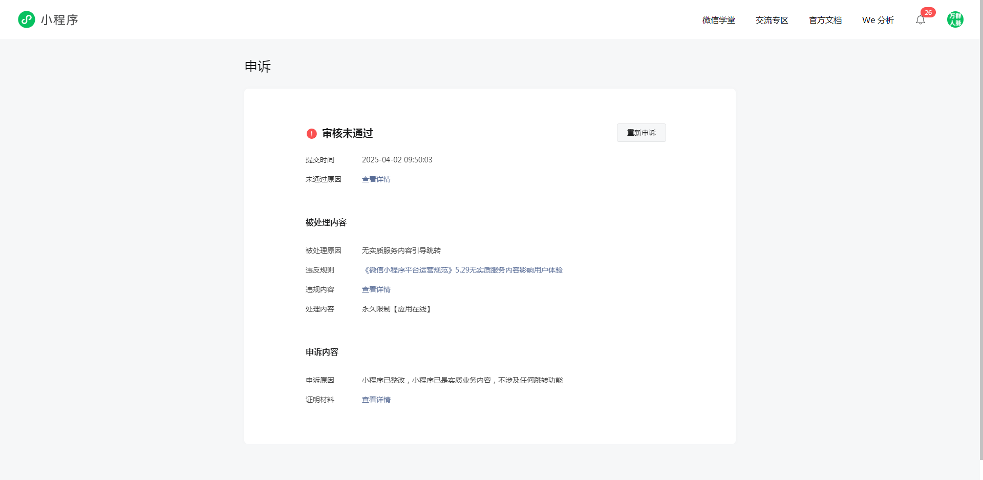 小程序申诉一直不通过,小程序已经整改,现已是最终运营版本,内容已是实质业务内容,不涉及任何跳转功能,申诉却一直不通过,驳回原因也一样,小程序里已经没有任何跳转内容,为什么还是一直申诉失败?