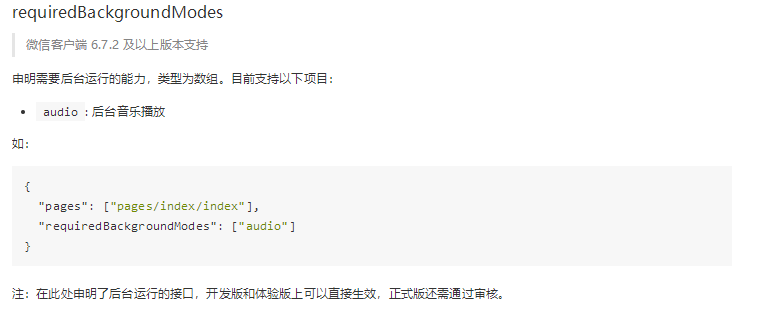 在app.json加上这句话"requiredBackgroundModes":["audio"]