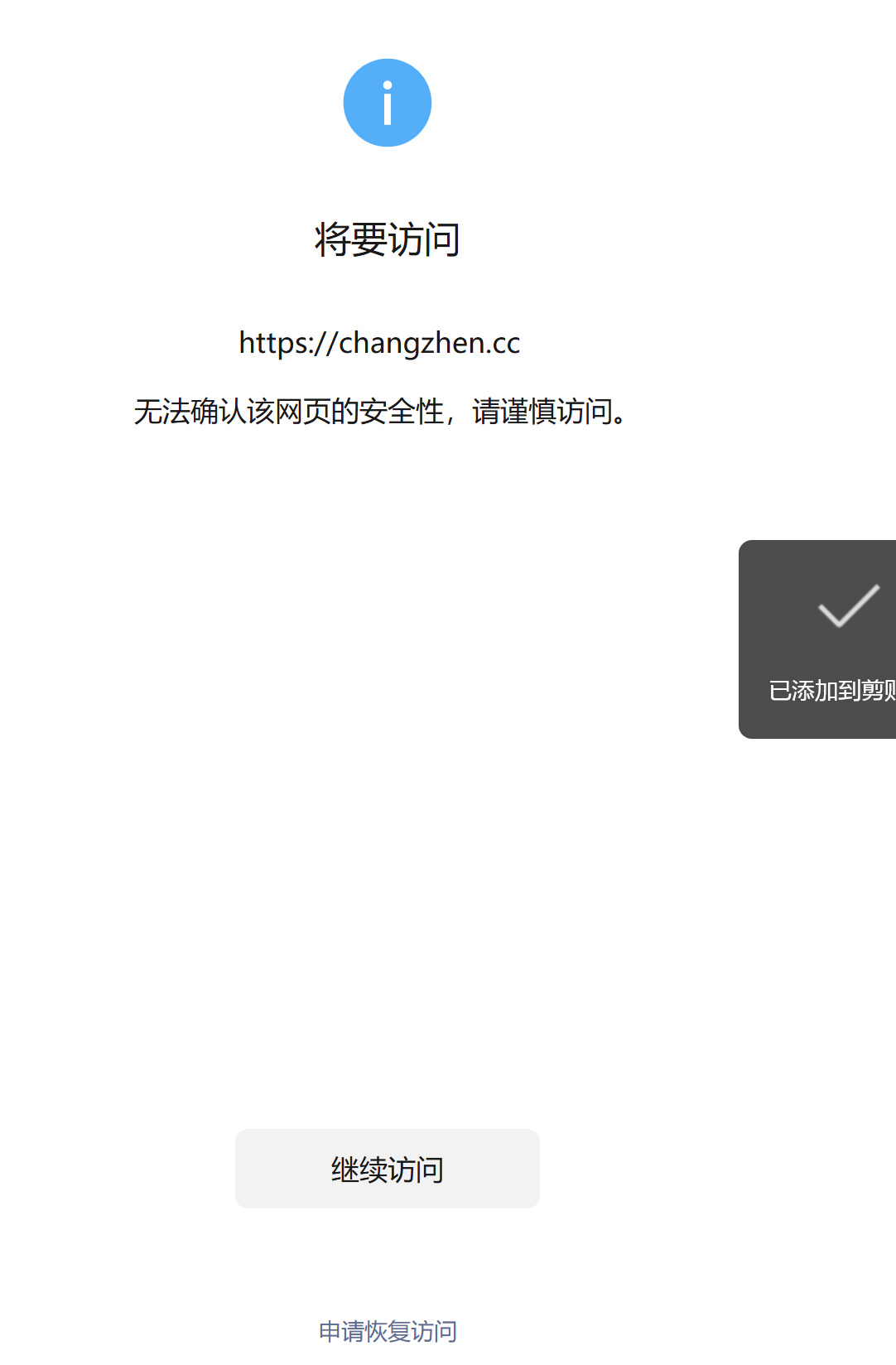 您好(https://changzhen.cc ) 此网站微信中访问提示 ‘无法确认该网页的安全性,请谨慎访问。’字样,其子域名也被相应拦截如:(https://mini.changzhen.cc),