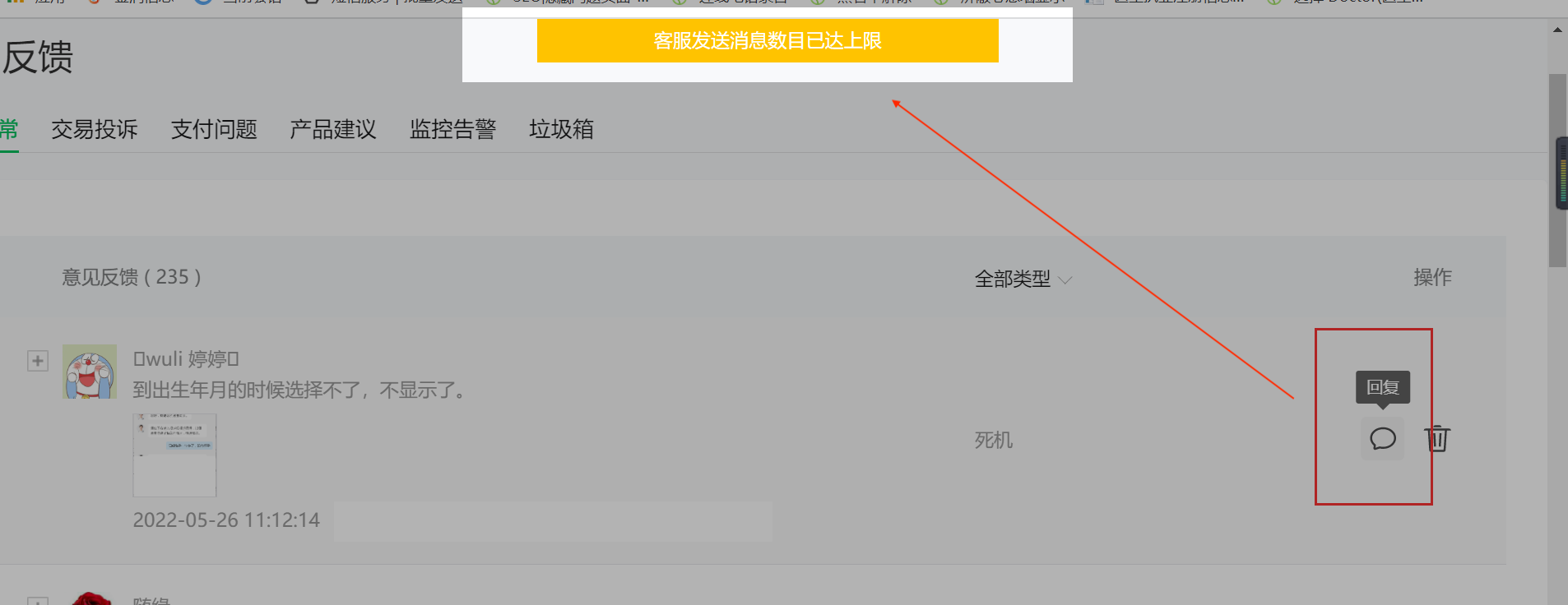我们在回复用户反馈时,点击回复按钮就提示“客服发送消息数目已达上限”。但是还没有给用户回复过,也没有超过48小时,这是怎么回事?