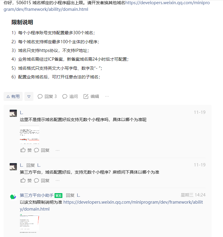 代开发的小程序域名配置说明中描述使用【2配置小程序业务域名】接口,通过第三方平台支持为无数个商家小程序配置业务域名。在其它回答的帖子中看到只能更换域名。想要咨询并明确下是否可以使用【2配置小程序业务域名】进行配置,无需更换域名。还是必须要更换域名进行配置。
