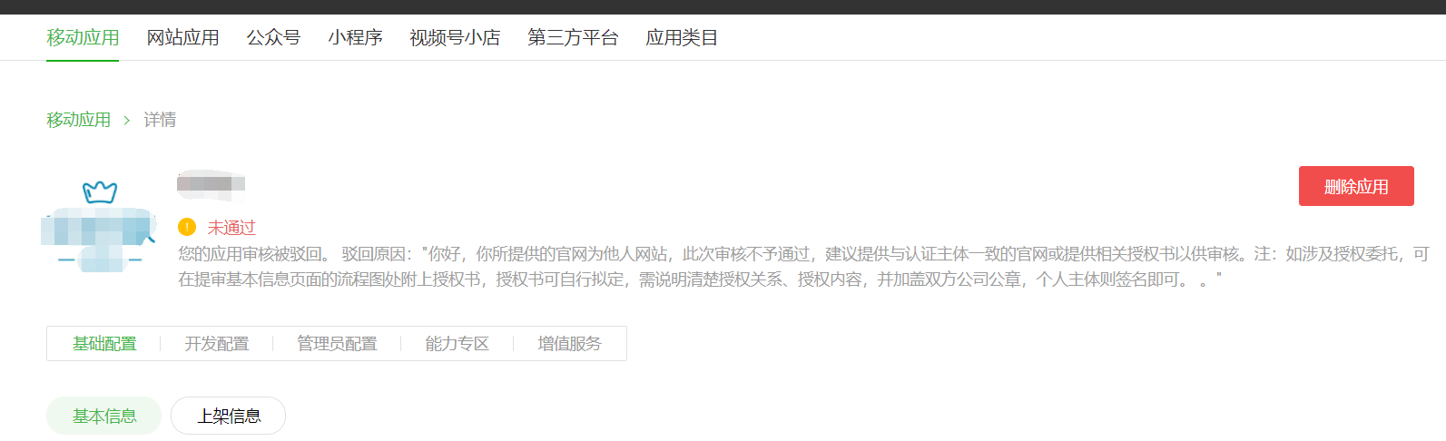 微信开放平台添加不同主体的移动应用,一直显示下面图片提示,这不同主体是不能绑定吗?