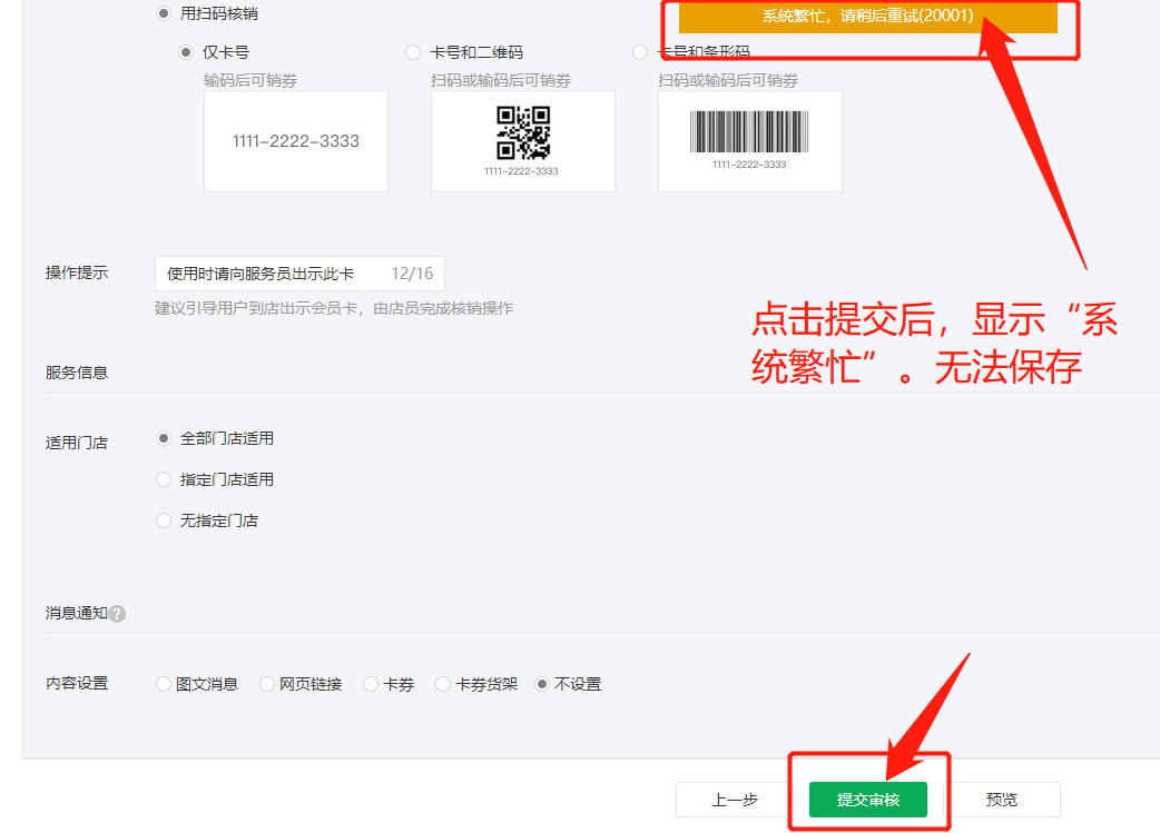 公众号后台修改会员卡信息后,提交审核时,显示“系统繁忙”,无法保存。