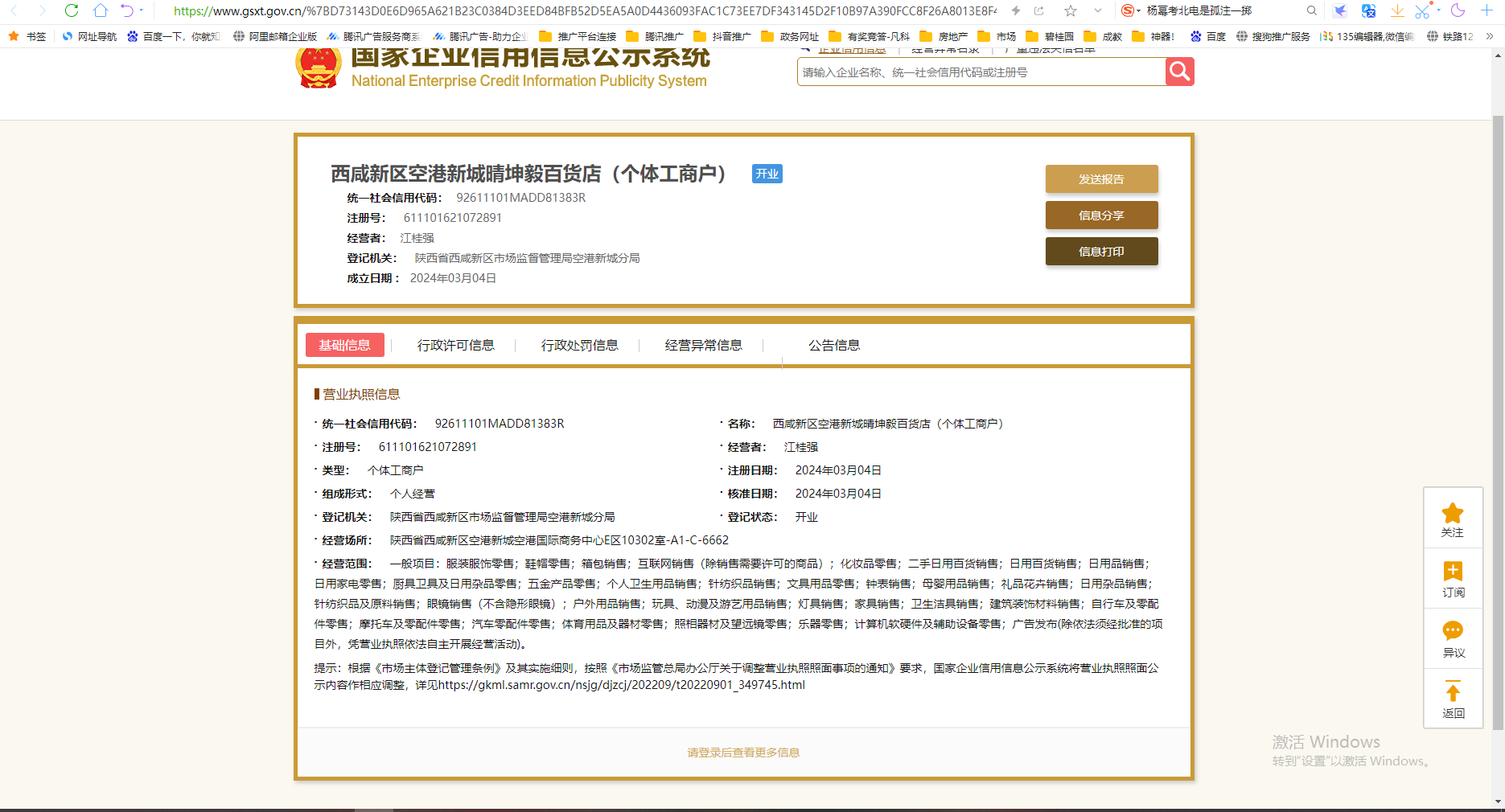 名称: 西咸新区空港新城晴坤毅百货店(个体工商户)