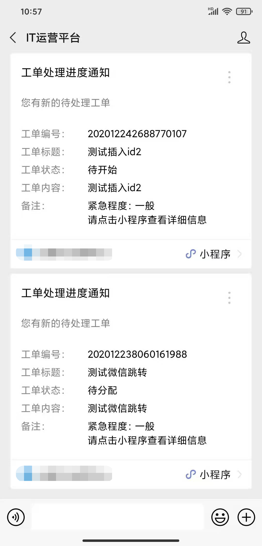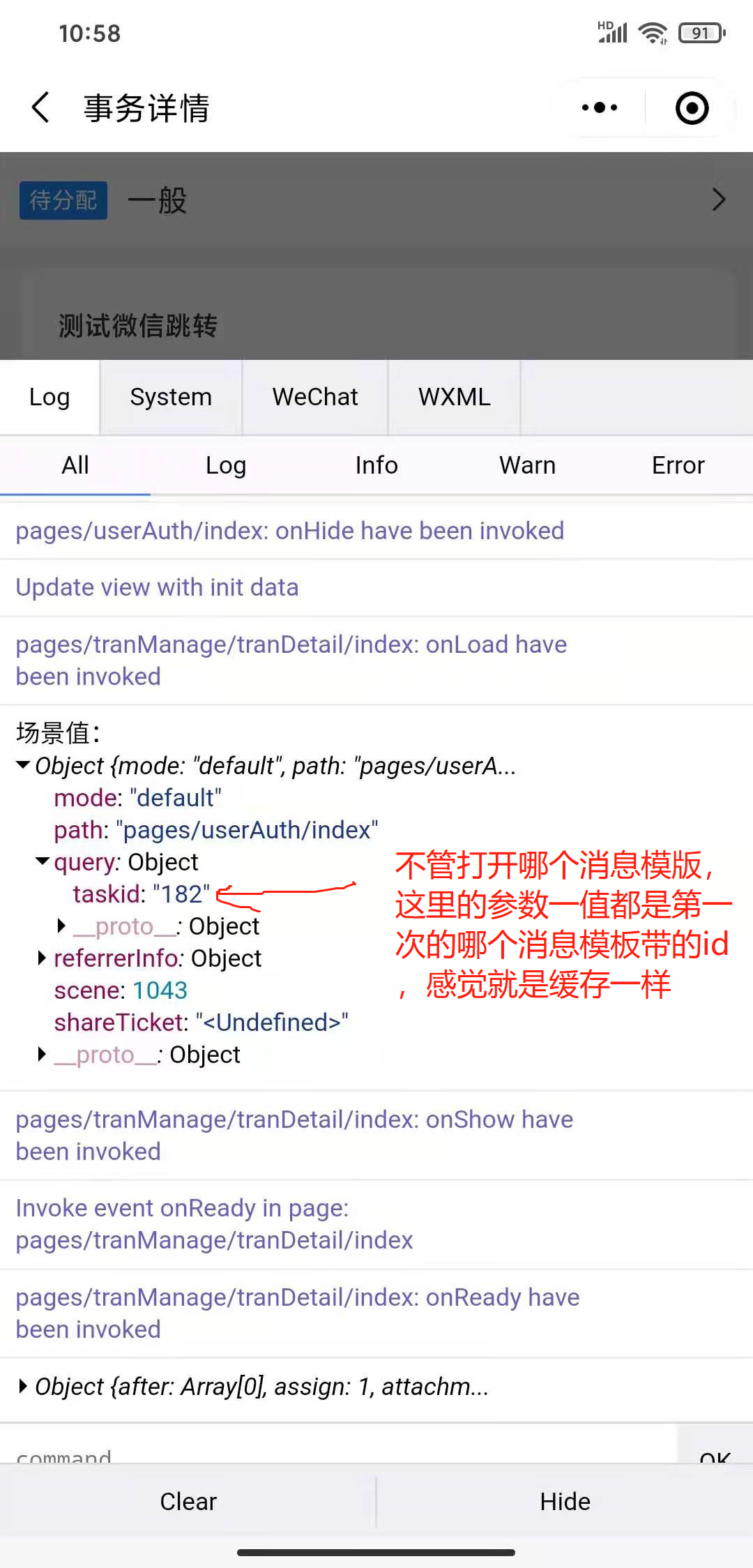 BUG一:我们小程序有个需求,就是通过微信公众号消息查看到小程序中的详情页面,公众号消息点击时会传一个task_id参数到授权页面,授权页面登陆成功后,通过wx.getLaunchOptionsSync方法获取到scene场景值,判断scene为1043后就跳转到详情页面,(每个消息模版所带的task_id不同),但是我发现,点击模板消息后,只有第一次带的task_id,后面不管点哪个消息模板,传到小程序的task_id始终是第一个消息的task_id。(下面截图)