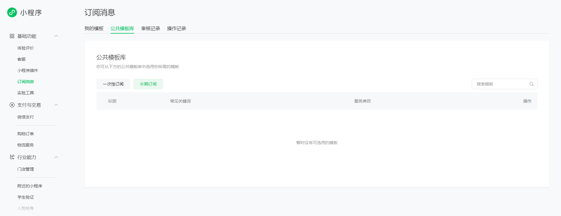 你好,长期订阅消息目前只对政务民生、医疗、交通、金融、教育等部分二级行业类目进行开放,目前只支持少量民生公共服务节点通知,并非所有场景都支持。如账号已有类目在支持的范畴内,默认会有长期订阅入口。长期订阅模板库有模板可以进行调用,没有模板说明暂时不支持。