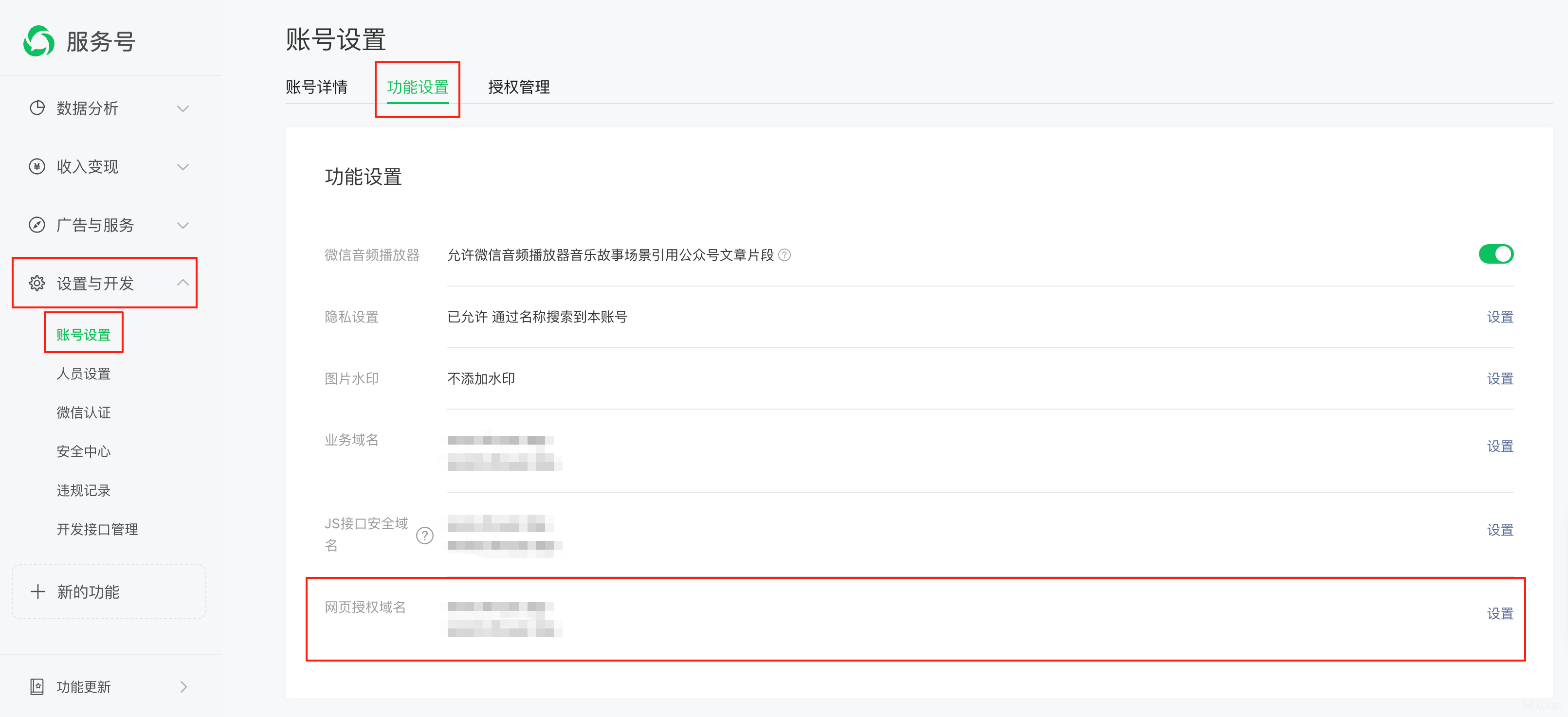 需要配置下「网页授权域名」,一般是已完成微信认证的服务号才支持网页授权功能,可以在 设置与开发 -> 账号设置 -> 功能设置 里面看到「网页授权域名」的配置入口。