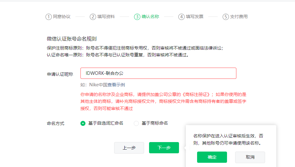 使用1年多的小程序【名称:IDWORK联合办公】在今年要提交年度审核时,被告知涉及商标问题不能再使用,或者需要提交商标注册证。经过查询此名称并没有被注册商标,且也无同名的小程序或公众号,故申请持续使用此名称。 另外,如我司申请提交商标注册,从提交到出结果也需6-8个月的时间,已远远超过了年审最后期限,请给与处理持续使用,谢谢!