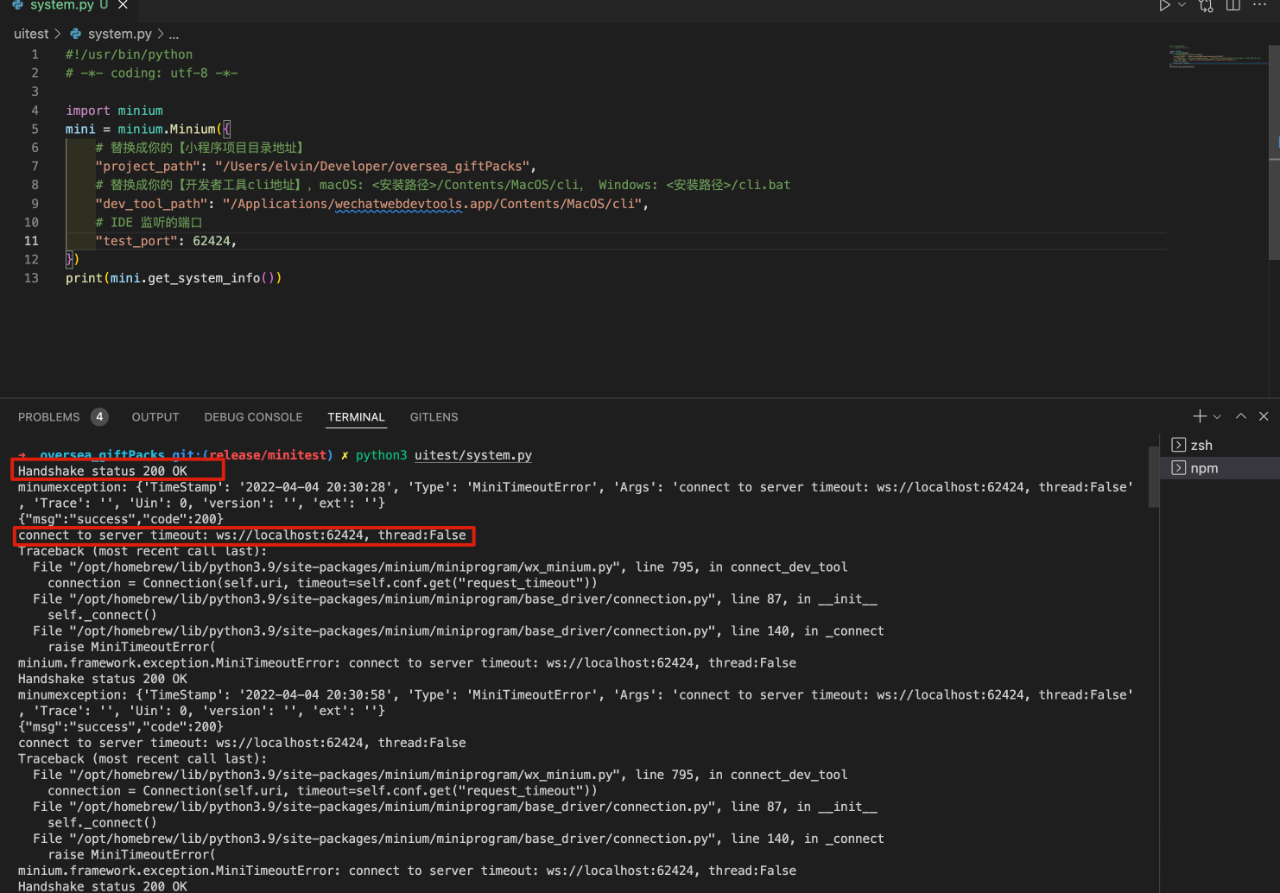 用 minium 连接到服务端口提示 timeout,但是又有提示 handshake status 200 OK?