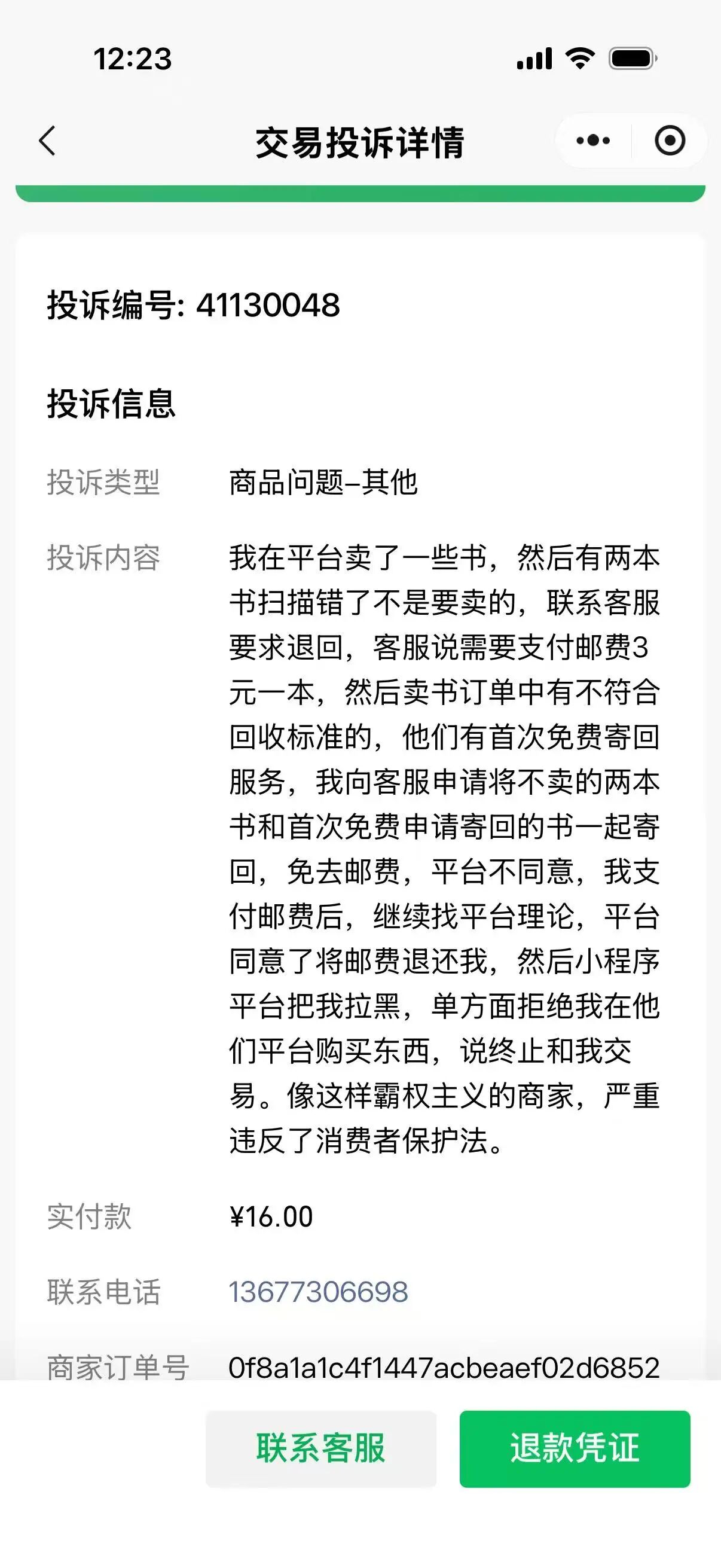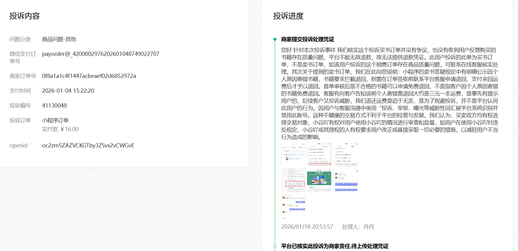 投诉编号:41130048,此用户通过买书订单进行投诉,其订单在1月6日完成收货后并未反馈商品有任何问题且未在订单申请过售后,存在争议的部分我司有上传相关凭证并附详细文字进行描述,贵平台为何要求上传退款且判定商家责任?这种滥用投诉功能且不讲诚信的消费者商家没权进行交易干涉吗?买卖双方不应该都能拥有选择交易的对象吗?还请相关工作人员重新核实处理。