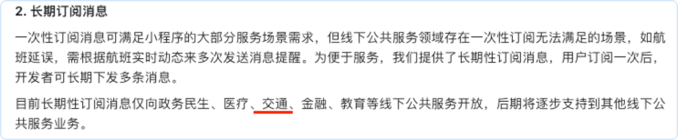 我们的订阅消息都是 ‘功能性’ 的。车主发布行程后,有乘客预定,我们需要发消息通知给车主,如果车主收不到微信的消息通知,很多车主就会默认无人订车,导致车主频繁爽约的情况。对于乘客来说,如果预定的行程被车主取消,也需要消息通知,如果不发订阅消息通知,乘客会默认已经预定的行程按时出发,而车主爽约对乘客的影响很大,可能导致乘客上班迟到、赶不上飞机高铁等情况。