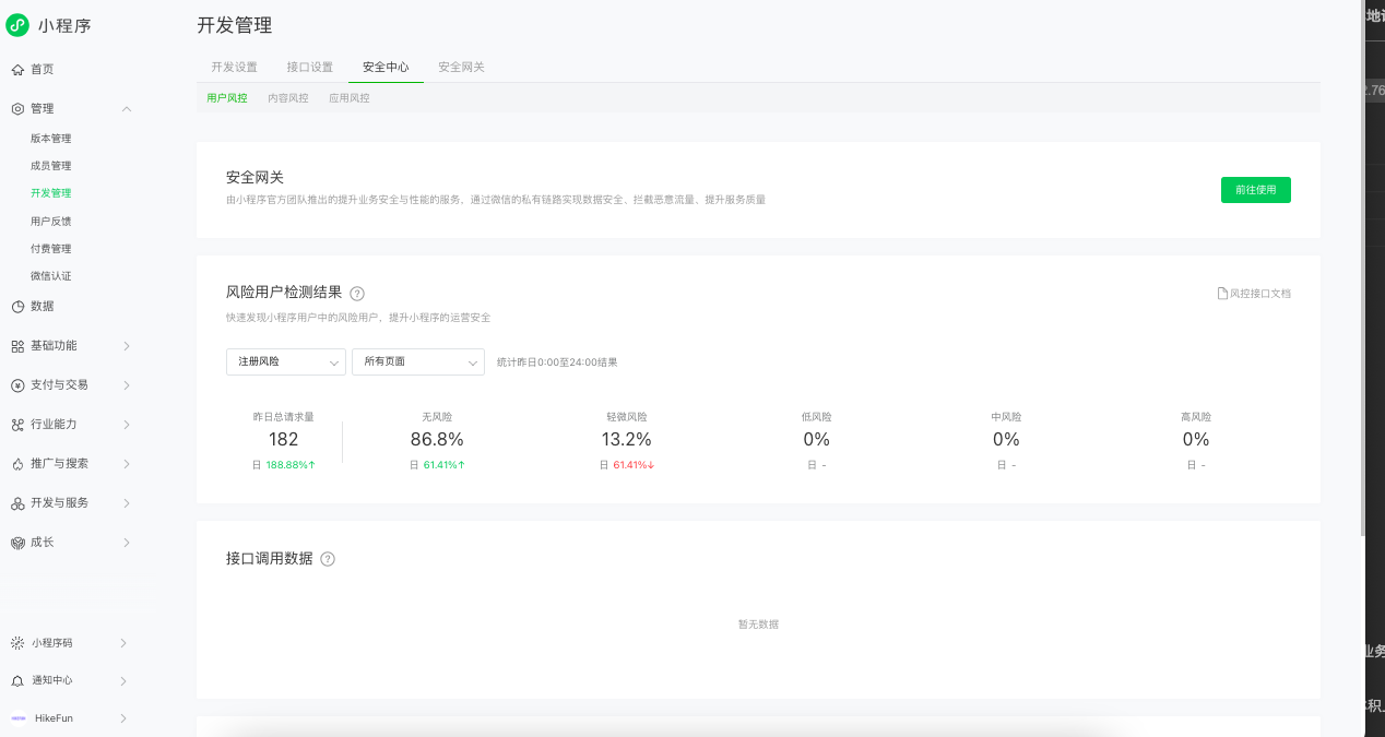 官方提示在微信小程序后台开发设置-安全中心-用户风控里开通 但是没有看到这个接口的任何显示