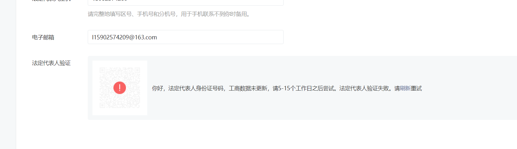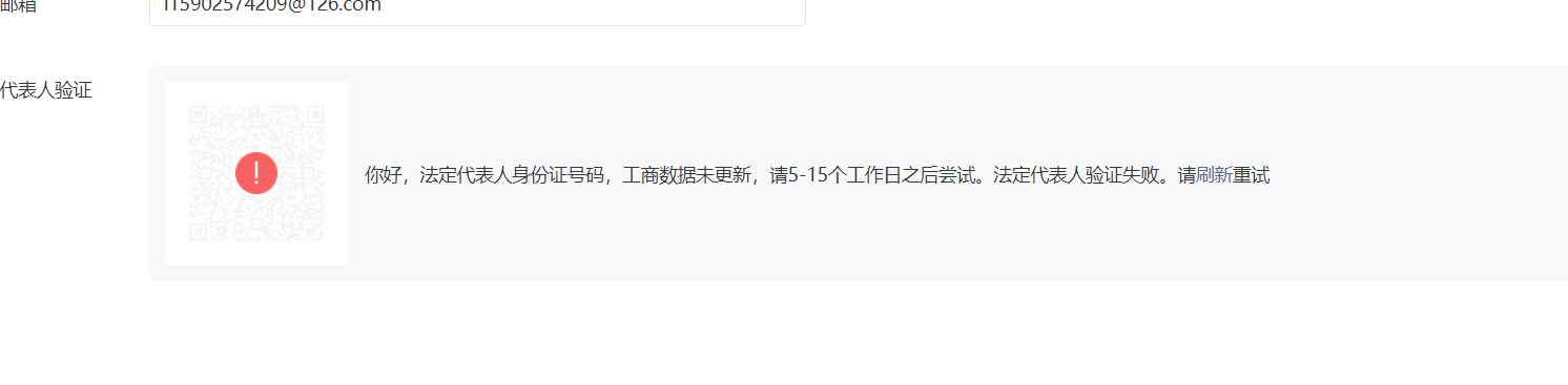 你好,核查发现填写的主体名称与营业执照上的主体名称不一致,故法人验证失败。请严格按照营业执照的主体名称填写。