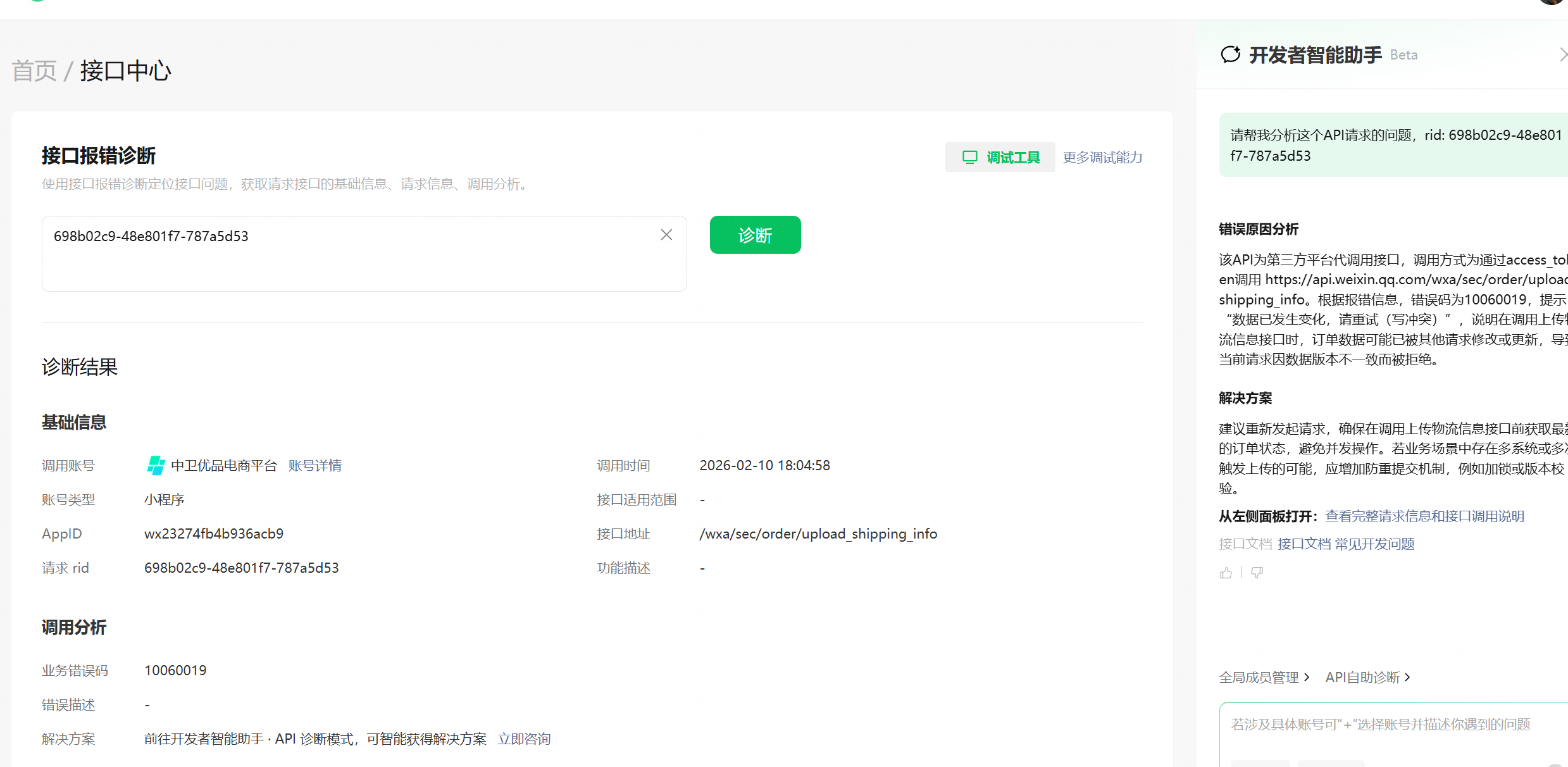 2026-02-10 18:04:58.054 INFO 10912 --- [ConsumeMessageThread_zwupin_order_group_13] c.l.m.w.serviceimpl.WechatMPServiceImpl : 微信小程序请求结果:{"errcode":10060019,"errmsg":"数据已发生变化,请重试(写冲突) rid: 698b02c9-48e801f7-787a5d53"}
