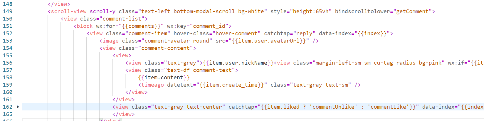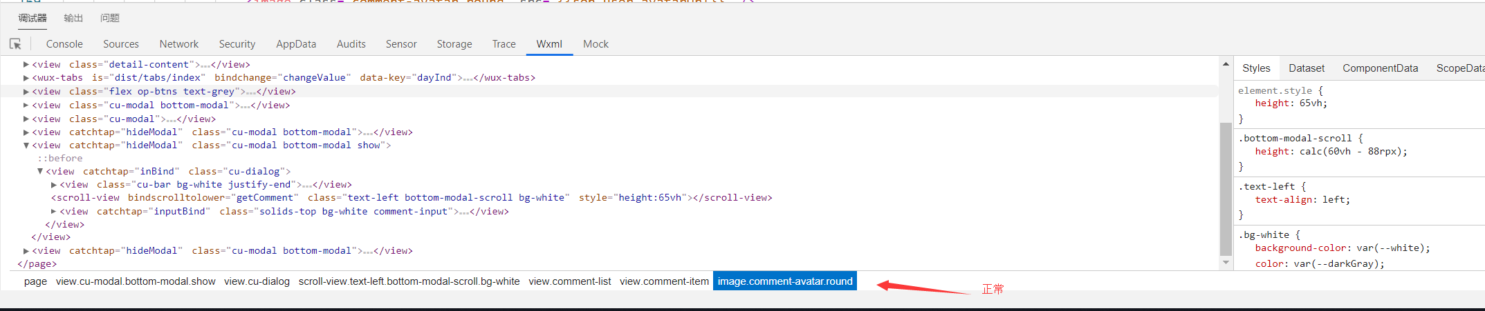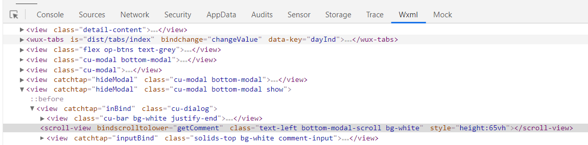 代码部分证明是有内容的,但是在wxml中是空的,并且左上角的元素选择器选择scroll中的元素后路径可以定位到选择的元素的,但是其余也都是只能选择到scroll元素上(如下图)