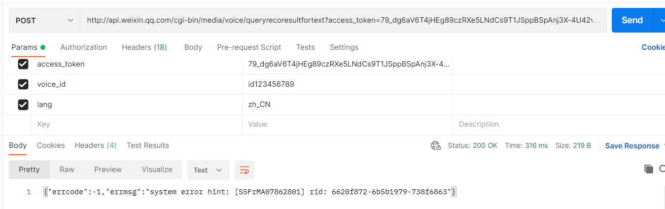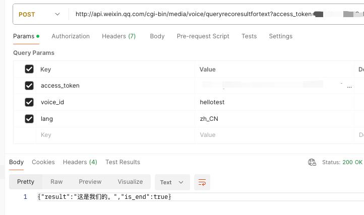 要注意提交语音后,要在10秒内调用「获取语音识别结果」接口。