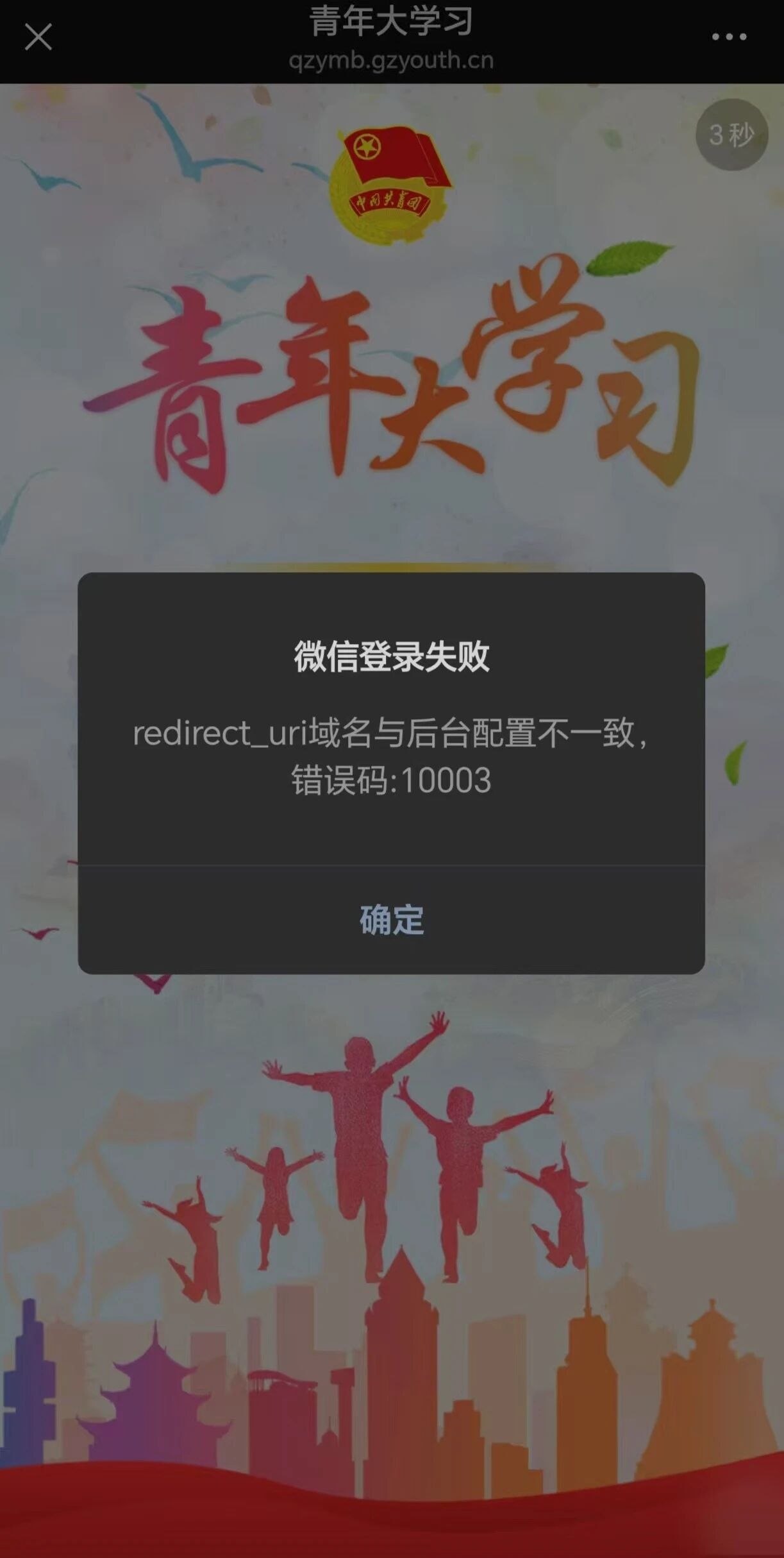 我没搜索到青春贵医的公众号ID,它的微信号是guiyituanwei-,我关注了服务号“青春贵医”,在它的聊天页面能找到“青年大学习”,每隔一段时间我们都要打开青年大学习完成相应的课程任务,今天打开青年大学习时,页面显示“微信登录失败,域名与后台配置不一致”,求解决方案。