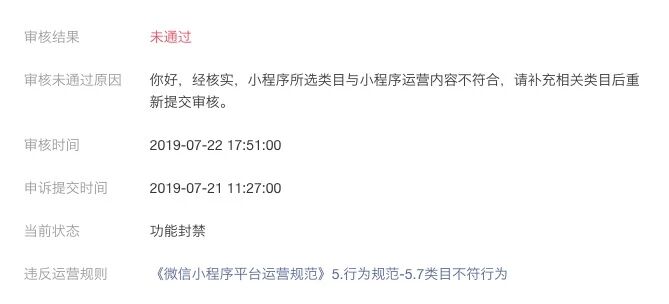 之前小程序因涉及打赏功能,部分功能封禁。且由于申诉过一次,没有二次申诉的入口。