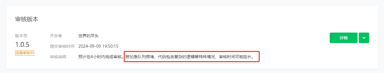 注:若加急队列拥堵、代码包含复杂的逻辑等特殊情况,审核时间可能延长。请了解。