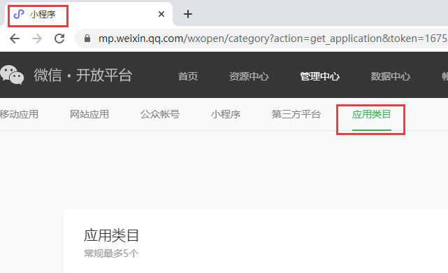 进入开放平台 => 管理中心 => 应用类目,此时浏览器上面的标题是【小程序】?