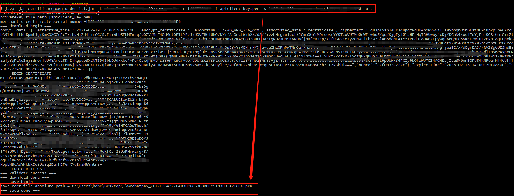 (2)执行:“java -jar CertificateDownloader-1.1.jar -f 商户私钥文件路径 -k 证书解密的密钥 -m 商户号 -o 证书保存路径 -s 商户证书序列号”就行了。
