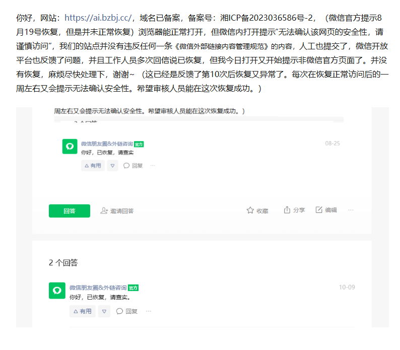 你好,网站:https://ai.bzbj.cc/,域名已备案,备案号:湘ICP备2023036586号-2,(微信官方提示8月19号恢复,但是并未正常恢复)浏览器能正常打开,但微信内打开提示“无法确认该网页的安全性,请谨慎访问”,我们的站点并没有违反任何一条《微信外部链接内容管理规范》的内容,人工也提交了,微信开放平台也反馈了问题,并且工作人员多次回信说已恢复,但我今日打开又开始提示非微信官方页面了。并没有恢复,麻烦尽快处理下,谢谢~ (这已经是反馈了第12次后恢复又异常了。每次在恢复正常访问后的一周左右又会提示无法确认安全性。希望审核人员能在这次恢复成功。)