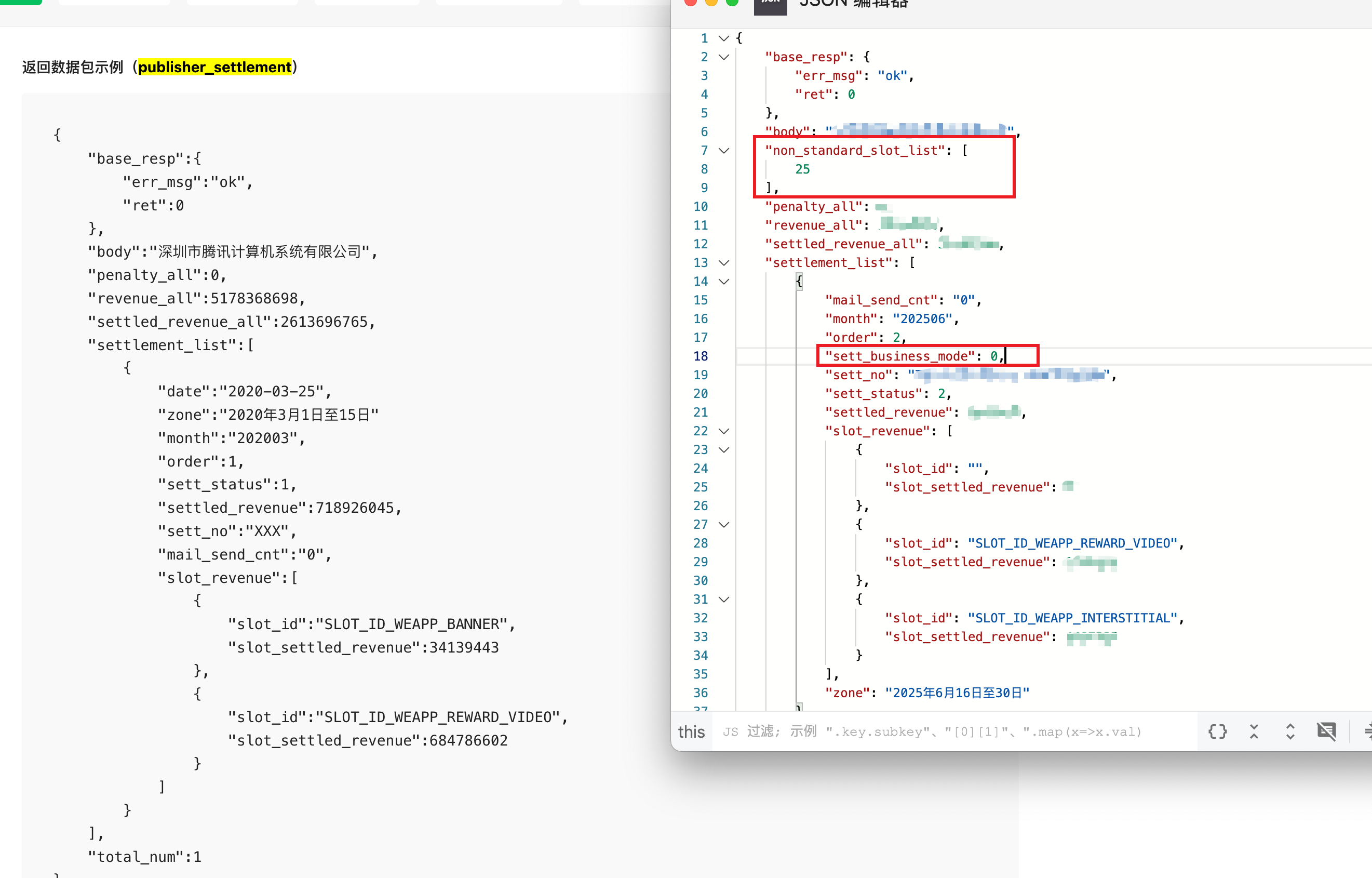 接口返回的数据中,出现了文档中没有的字段。左边是官方文档返回示例,右边是实际请求结果。 non_standard_slot_list、sett_business_mode, 请问这两个字段是什么含义??
