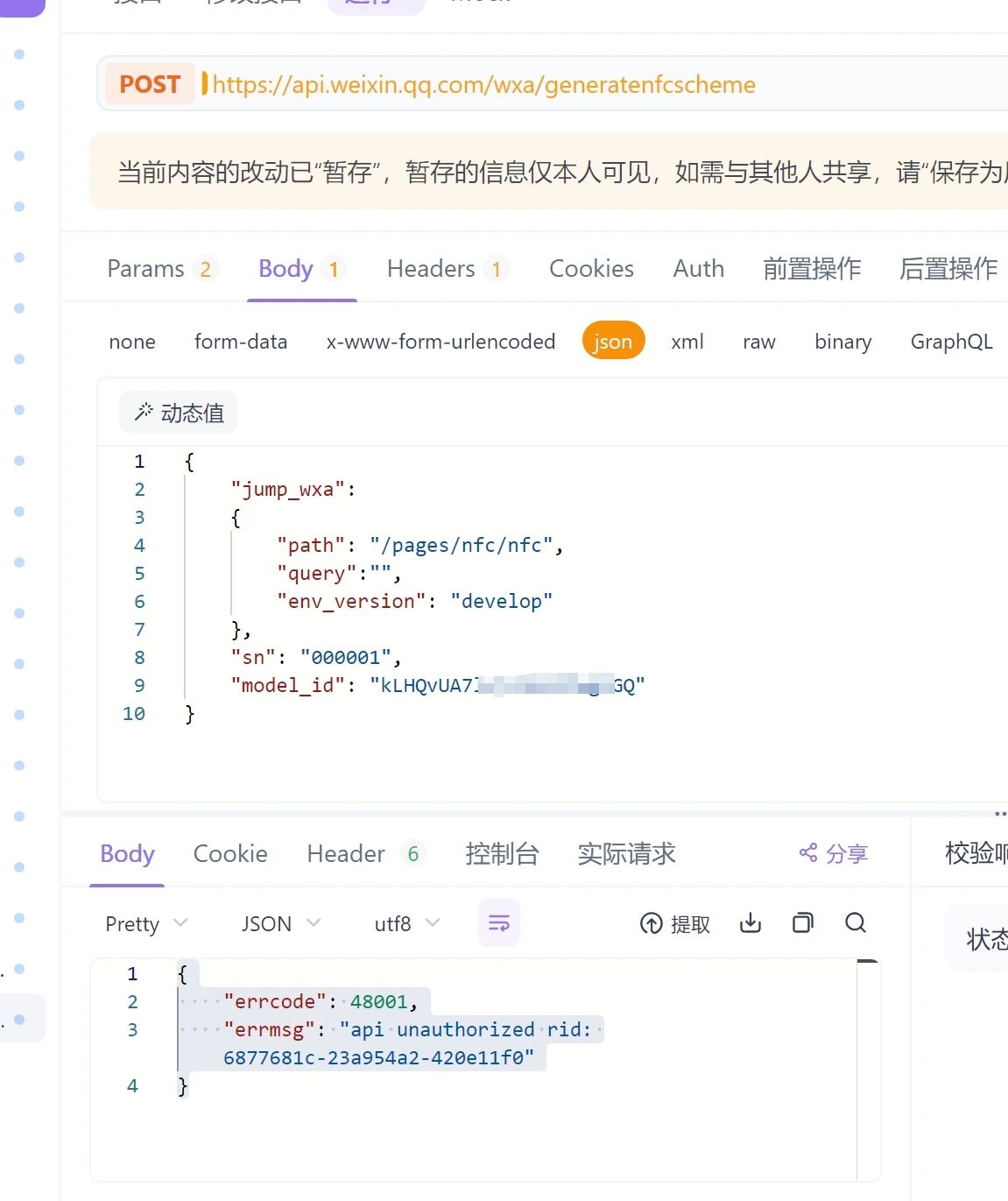 "errmsg": "api unauthorized rid: 6877681c-23a954a2-420e11f0"