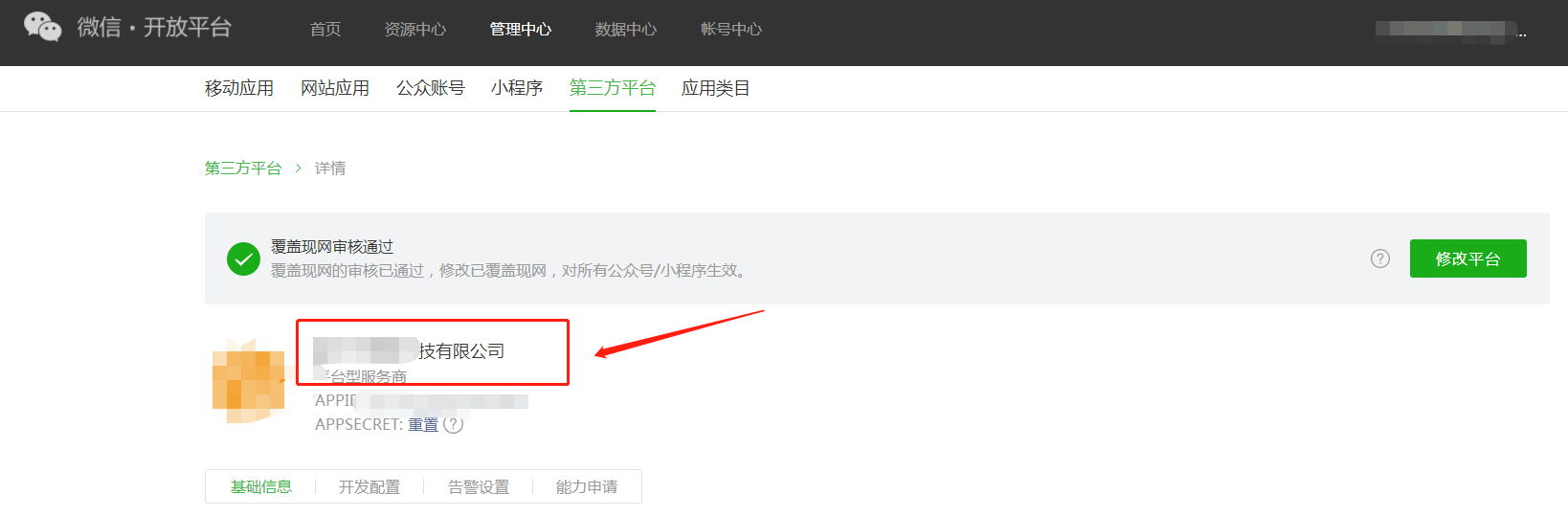 2.我看点击右面的修改平台可以修改基本信息,但是不敢改,不确定如果改了是不是会影响我们公司的小程序等的系统使用