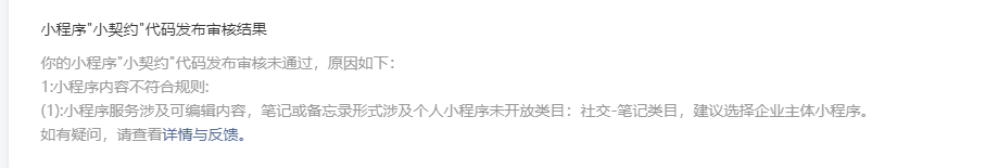 你好,经核实,贵方小程序【首页】涉及用户自定义内容的记录及分享,包括文字、图片、视频、音频等,涉及个人小程序未开放类目:社交-笔记类目,请申请选择企业主体小程序,或者修改小程序功能定位。