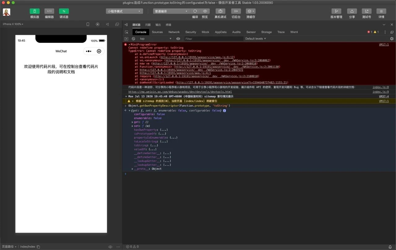 引入代码片段后在控制台可以看到如下的错误,不引入plugins就没有这个问题,由于需要测试插件,可以使用测试appId