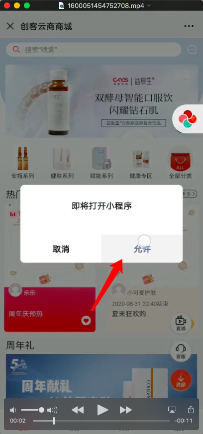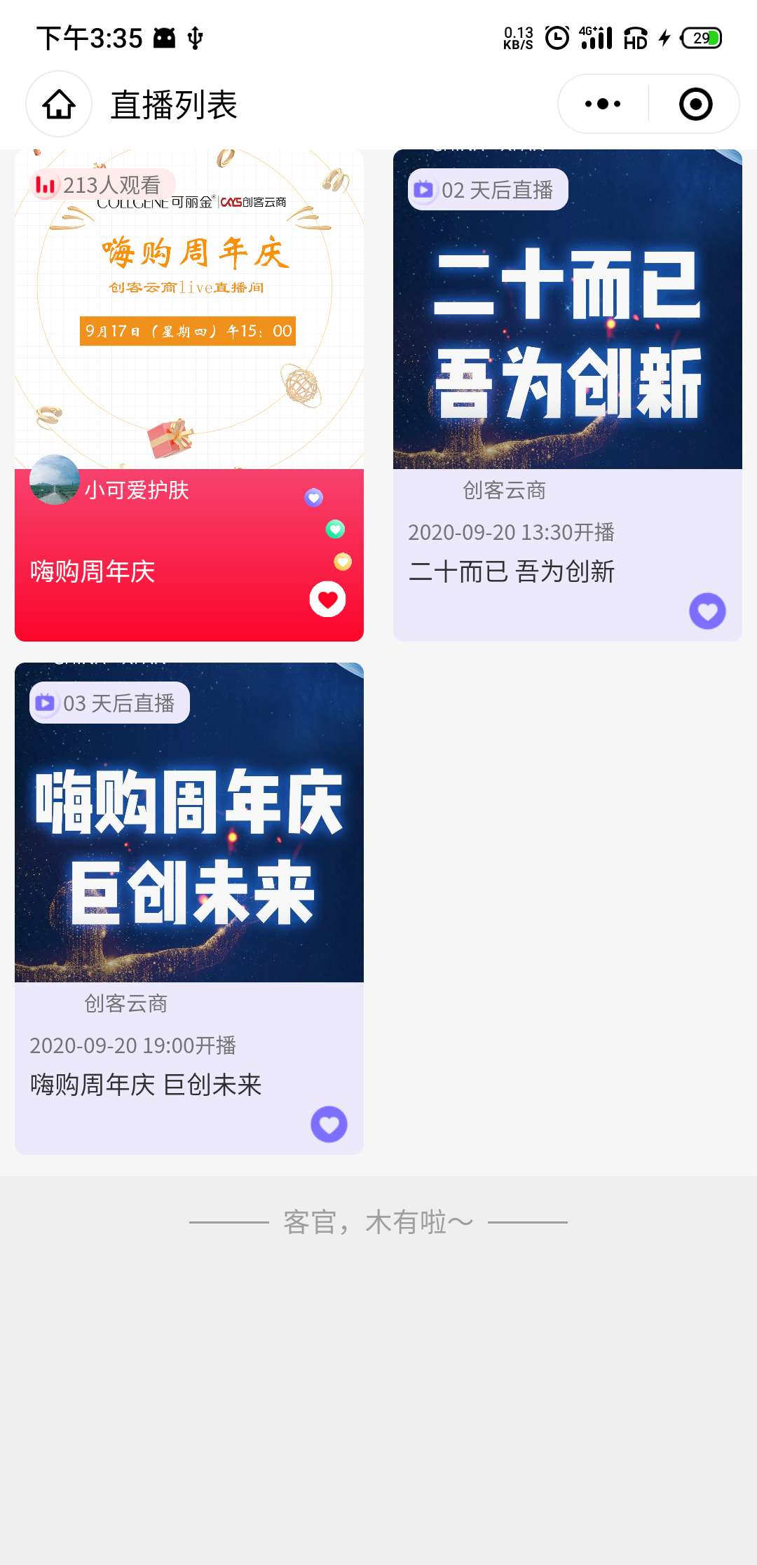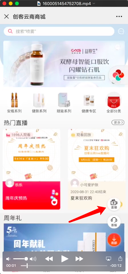 进入创客村公众号,点击商城入口进入商城首页,点击右下角直播浮标进入小程序直播列表