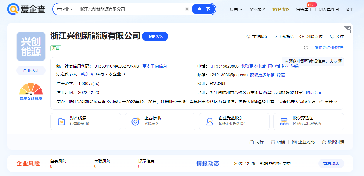 浙江兴创新能源有限公司,社会信用代码,91330110MAC6279NXB,法定代表人,钱东培
