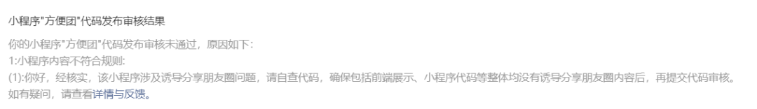 你好,经核实,贵方小程序最新提审版本【拼团分享】页面涉及诱导分享朋友圈,请自查代码,确保包括前端展示、小程序代码等整体均没有诱导分享朋友圈内容后,再提交代码审核。