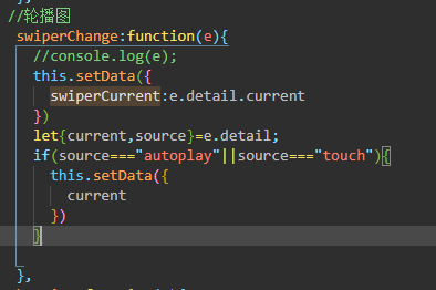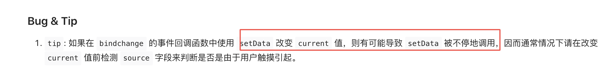 swiperChange(e) { let { currentIndex } = this.data let { current, source } = e.detail if (currentIndex !== current && (source === 'autoplay' || source === 'touch')) { setTimeout(() => { this.setData({ currentIndex: current }) }, 100) } }
