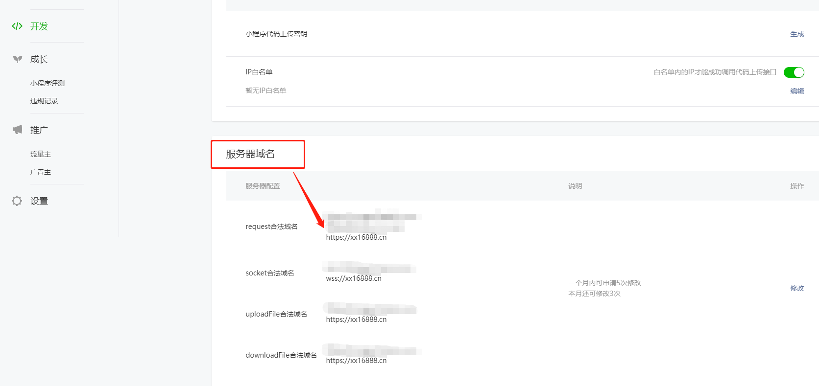 我的小程序,需要增加后台 服务器域名,https://www.xx16888.cn,该域名已经经过阿里云备案,配置了ssl证书,应该H5可以正常访问的,但是配置小程序,就报不合法了。如下图: