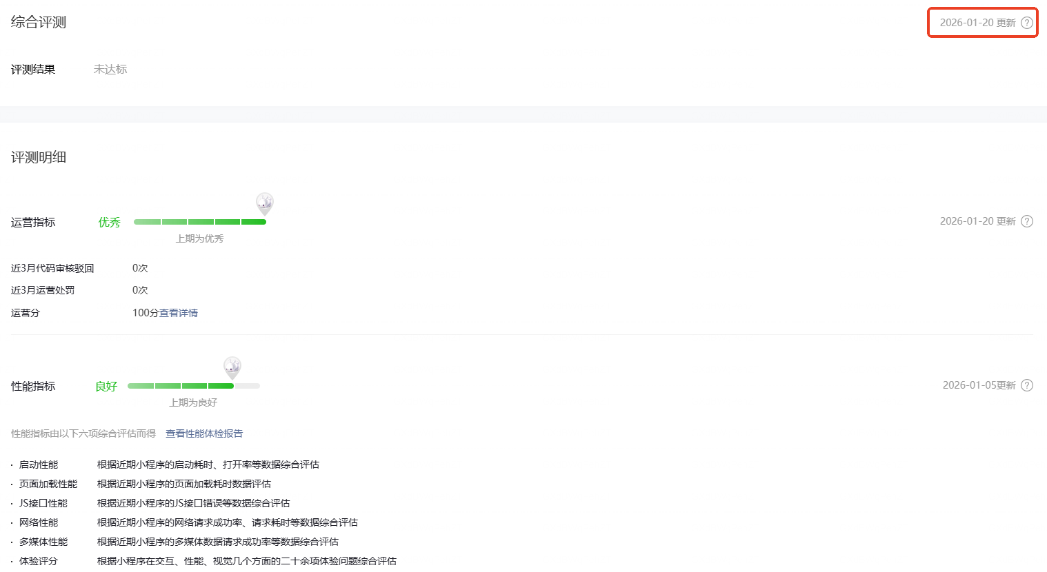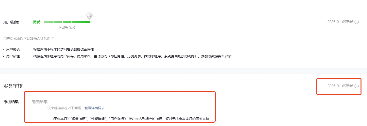 每个月审核的重新审核的时候都会有几天是这样的情况,评测明细均达标,但服务审核不会更新,导致综合评测未达标。