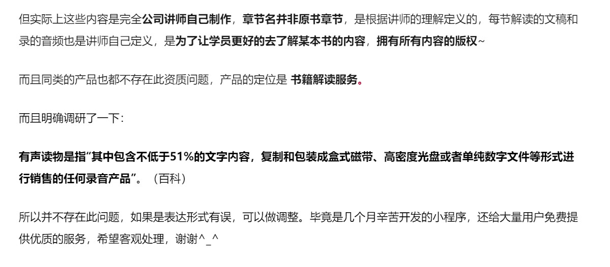 微信小程序的审核工作人员,你们好。 我司今年重新上架的小程序已于年前与官方沟通并明确非“有声读物”,而是书籍解读服务(我司拥有内容的全部版权),