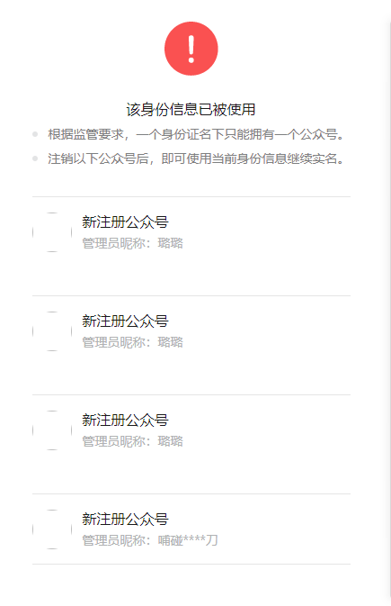这四个公帐号不是我本人在用的,我根本就没有注册过这4个公众号,我现在想知道如何注销这4个公众号帐号,不然我没法实名自已的公众号帐号