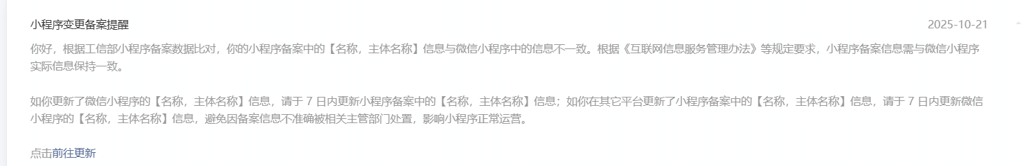 必须要变更(若未及时变更,平台将采取警告、功能封禁、强制注销备案等处置措施),变更期间不影响小程序正常使用
