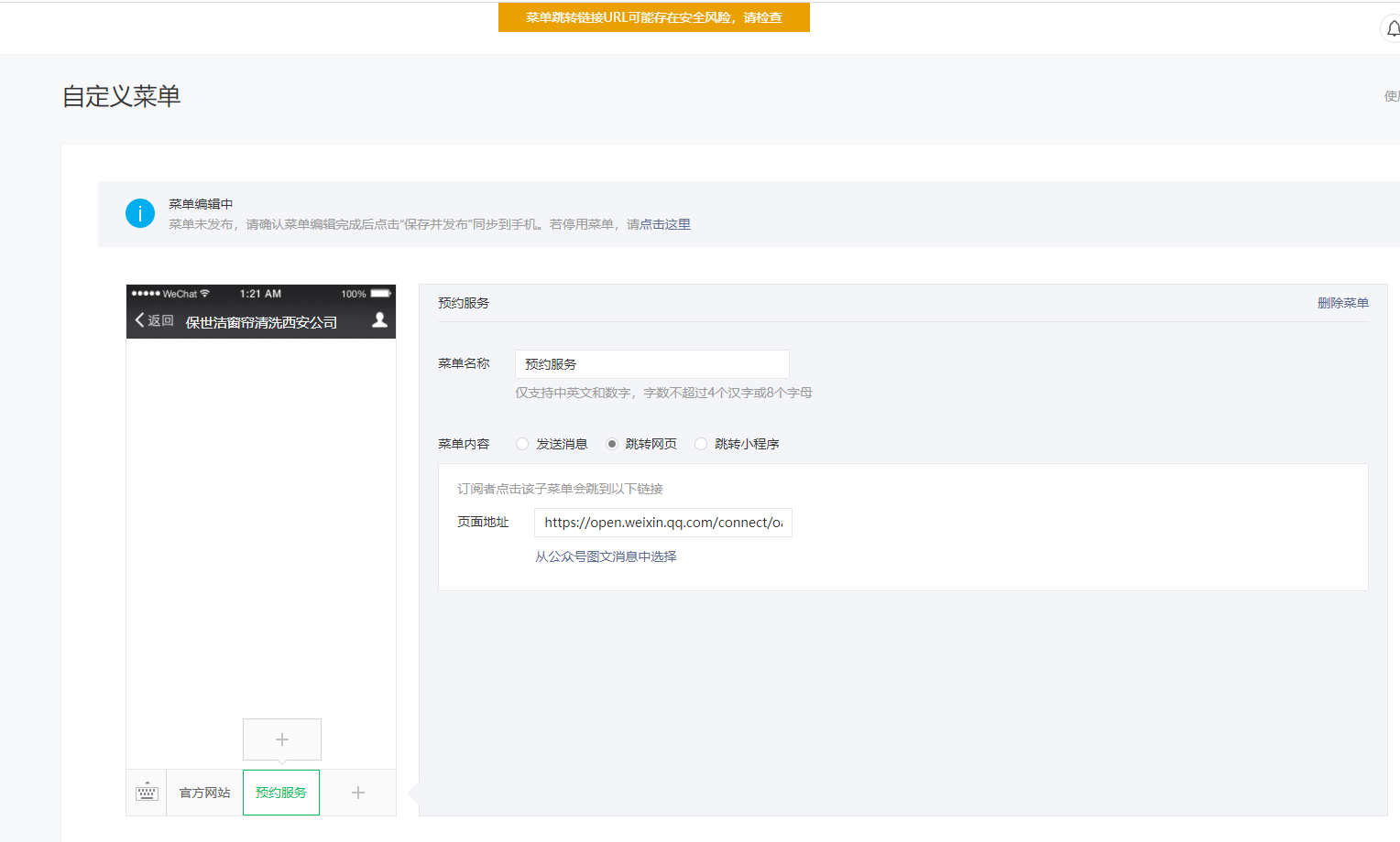 这个公众号已经是第二年使用了,第一年开发完成后使用全部正常,第二年后台服务器更换后,正常备案并且年审,但是自定义菜单无法访问,被告知,网页本身就是业务介绍以及预约订单,并无涉及到相关问题,申诉也被驳回,后来在公众号的自定义菜单中发现无法预览,提示URL可能存在风险,如图所示,请问怎么解决